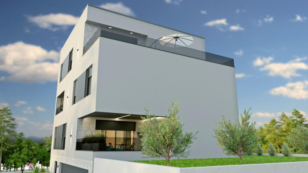 Na donjoj etaži se nalazi spavaći dio (dvije dječje sobe, master soba sa kupaonicom, garderobom i loggiom, kupaonica, gospodarstvo), a na gornjoj etaži se nalazi prostrani dnevno boravak integriran sa kuhinjom i blagovaonicom, velika terasa površine 90 m2, gostinjski wc i ulazni pretprostor.