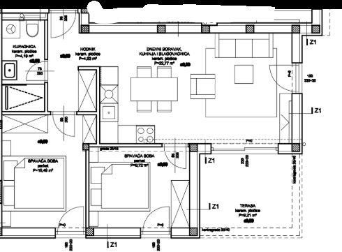Stan se sastoji od dvije spavaće sobe, hodnika, kuhinje s blagovaonicom i dnevnim boravkom, kupaonice, terase od 13,34 m², vrta od 2 m² te parkirnog mjesta od 3,75 m². Na vrhu zgrade nalazi se zajednička krovna terasa, idealna za opuštanje i uživanje u pogledu.