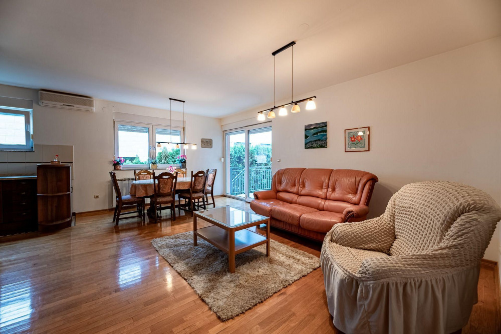 Prekrasan luksuzan, komforan stan ukupne površine 192 m2 u visokom prizemlju urbane vile sagrađene 2007 godine. Vila ima dizalo. Sam stan je površine 170,40m2. Uz stan se iznajmljuje garaža (30m2) za dva automobile, parking i vrt na korištenje. Sjajno iskorišten prostor sastoji se od ulaznog prostora, prostranog dnevnog boravka integriranog sa blagovaonicom, kuhinje, tri spavaće sobe, dvije kupaonice, gostinjskog WC, tuš kabine, vešeraja, prostranog hodnika, ostakljene loggie i terase. Visina stropova je 2,90m, čime je došao do izražaja volumen stana, prozračnost sa puno dnevnog svjetla. Velika staklena klizna vrata briše granicu između interijera I eksterijera, tako da dnevni boravak i blagovaonica su prostori koji imaju prirodnu vezu sa terasom i vrtom. Terasa i vrt su produžetak životnog prostora, mjesto okupljanja i odmora. Tome doprinosi i kamin na drva u dnevnom boravku. U hodniku su s obje strane ugradbeni ormari. Stan je kompletno namješten sa svim namještajem i uređajima. Stan ima odvojena brojila za sve potrošače: struju, plin i vodu. Zgradu odlikuje visoka kvaliteta gradnje, klima uređaji, alarmni sustav, Schuco stolarija, grijani preistup garaži. U garaži je voda I struja.